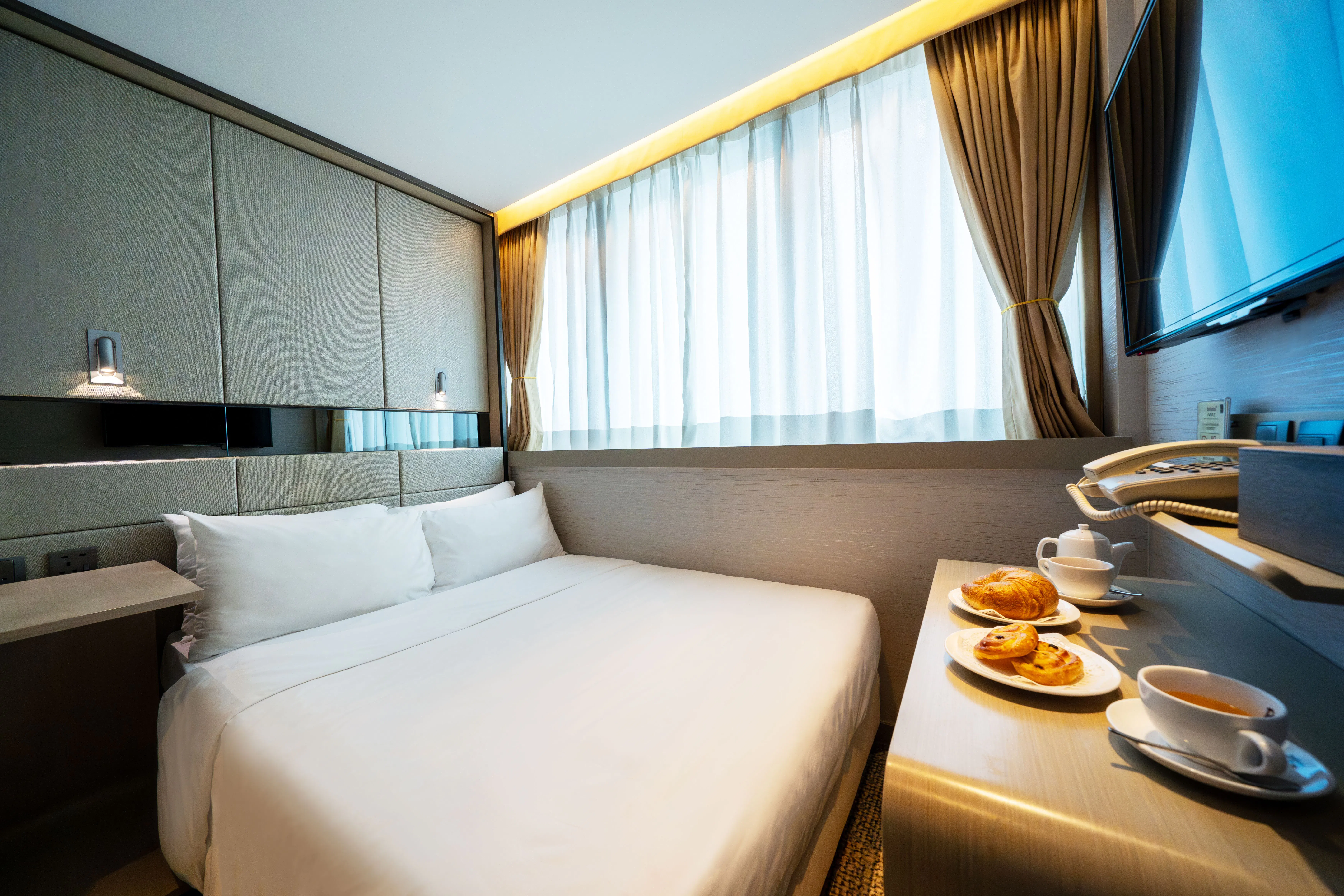 Premier Double room offers a double bed (4'5 x 6'3) with modern style, quality bed linens, 40' LED TV, Bathroom Amenities, branded Mattress by Simmons. Room size is around 132 square feet.