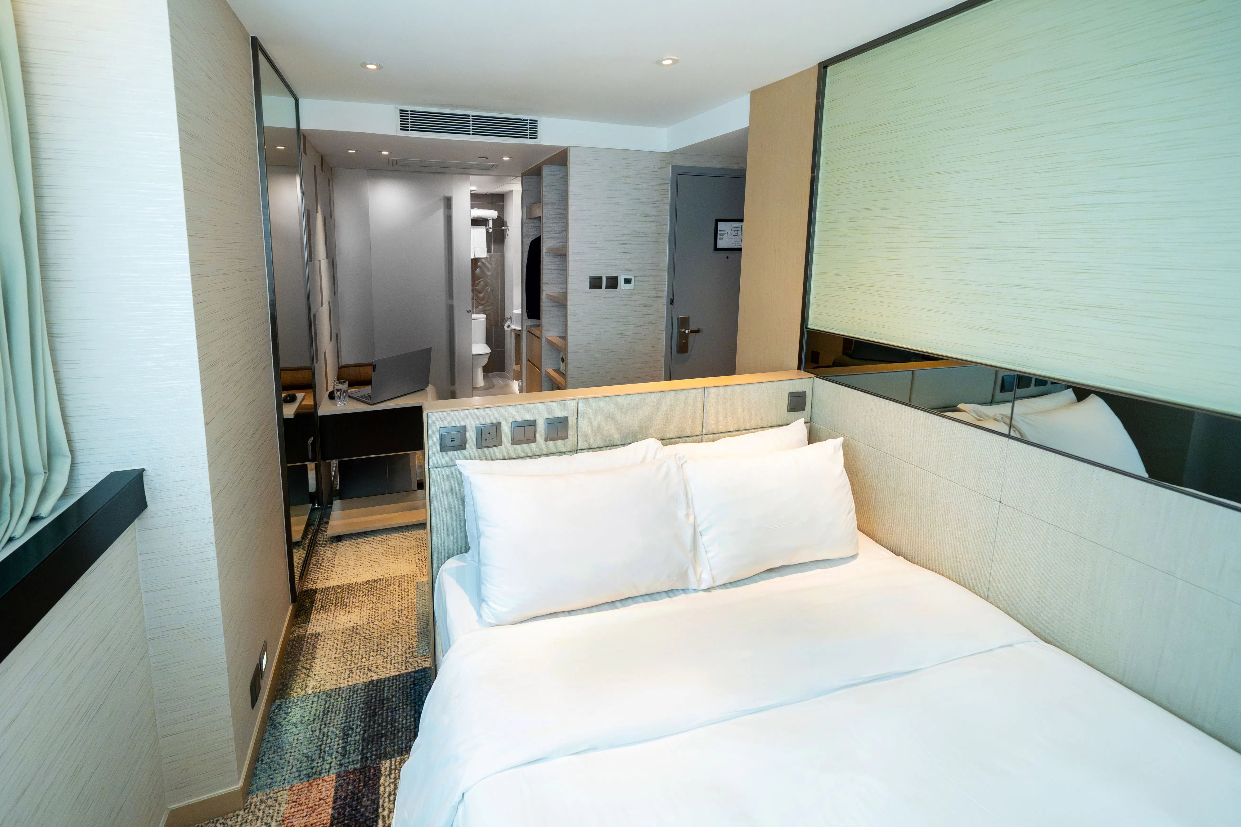 Signature room offers a queen size bed (5' x 6'3) with modern style, quality bed linens, 40' LED TV, Bathroom Amenities and branded Mattress by Simmons. Room size is around 198 square feet.
